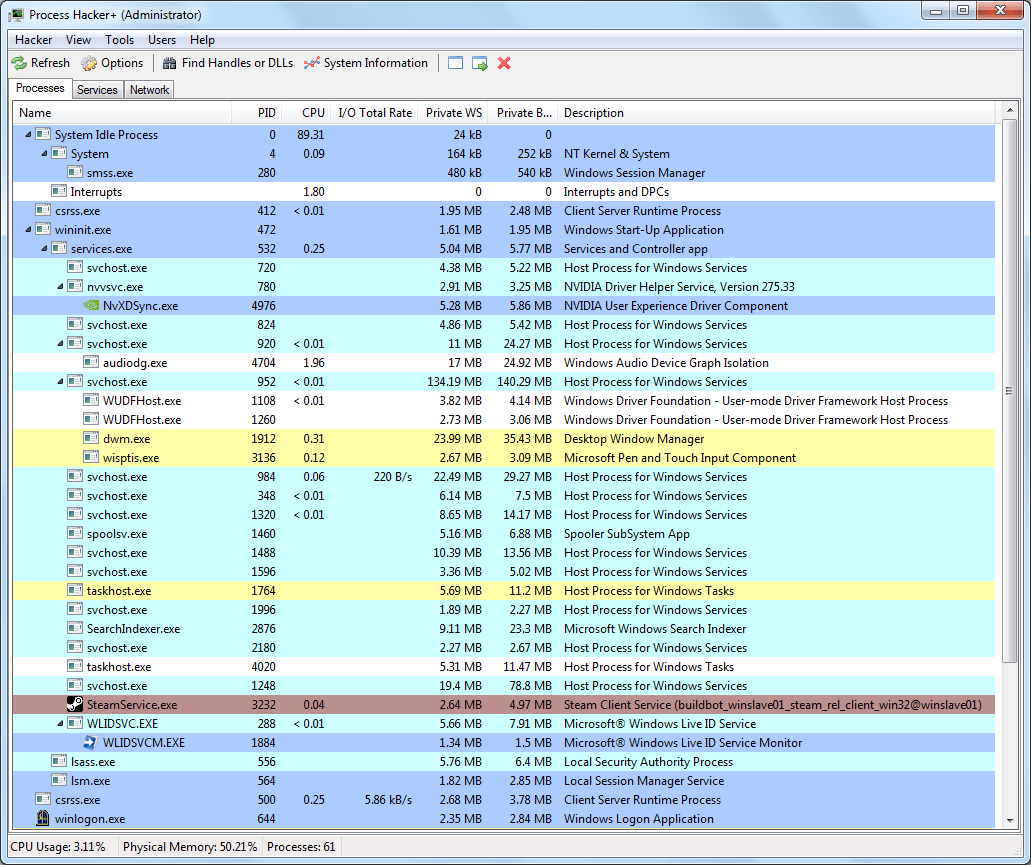 Nach dem Start werden alle laufenden Prozesse und Dienste so dargestellt, dass deren Abhängigkeiten untereinander ersichtlich sind. So lässt sich leicht erkennen, warum z.B. ein bestimmter Prozess nicht beendet wird, bzw. welche anderen Prozesse damit zu tun haben könnten. Darüberhinaus ist es per Klick möglich, alle Handles und DLL-Dateien einer bestimmten Prozess-Gruppe zu suchen. Prozesse und Dienste, die sich mit normalen Windows Boardmitteln nicht mehr beenden lassen, können mit dem Process Hacker gestoppt werden.